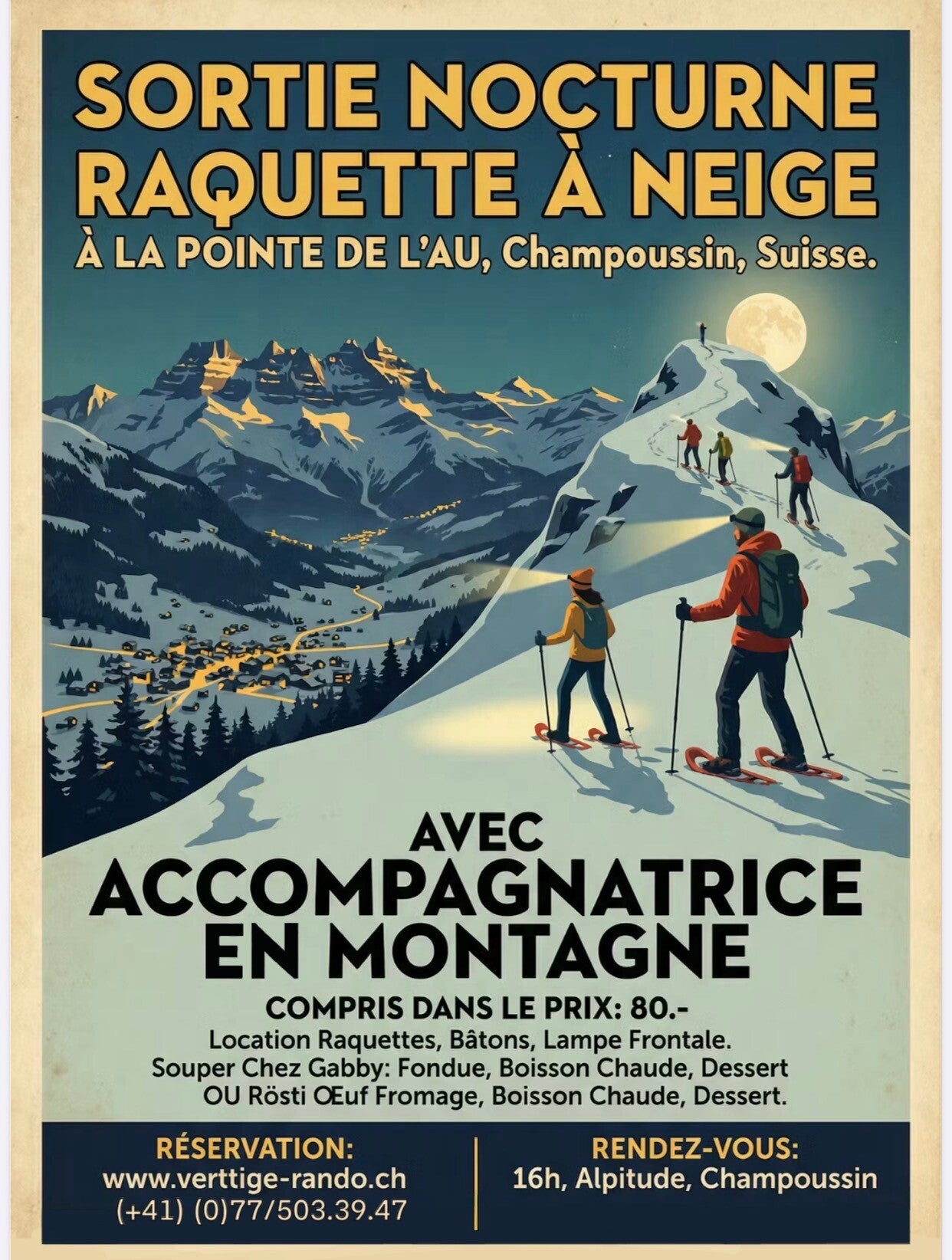 Sortie en raquettes: Au départ de Champoussin. Plusieurs possibilités selon envie; de jour ou en fin de journée. Repas chez Gaby1670, location chez Alpitude.